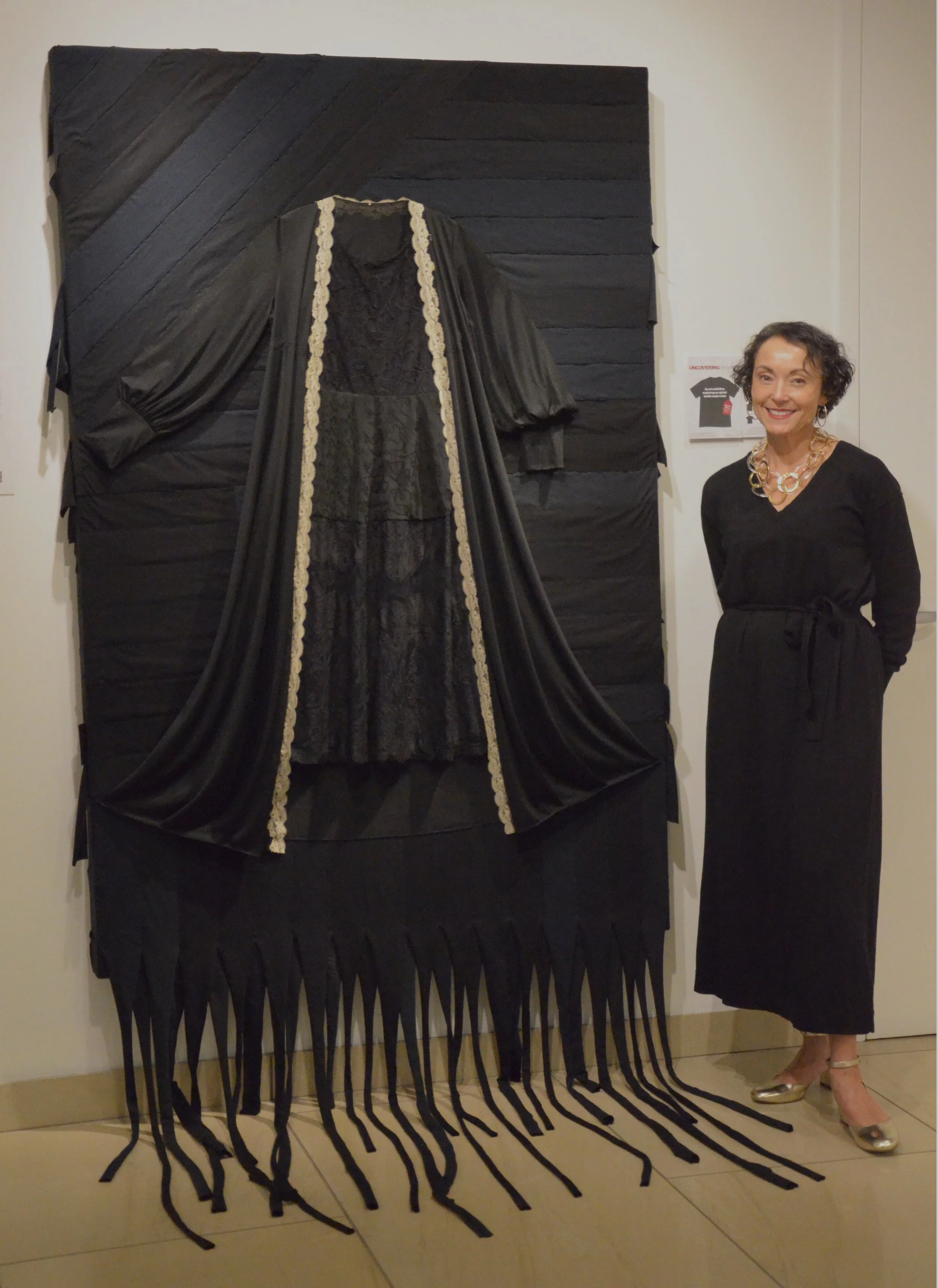 Guthrie’s method involved allowing the fabrics and garments to determine the composition. To create the canvas, T-shirts were cut into strips and hand-applied to a donated bed sheet. The piece is a recreation of a dress from three. Each was disassembled and then reassembled using the bodice from one dress. The base of the skirt section is a slip overlayed with the reassembled lace from the second dress and the embroidered fabric from the third thus reconnecting three garments. The piece not only symbolizes repair, but aims to call into question what we believe is worthy of repair, positing that, in fact, everything and everyone is worthy of repair. To repair is to reclaim value.