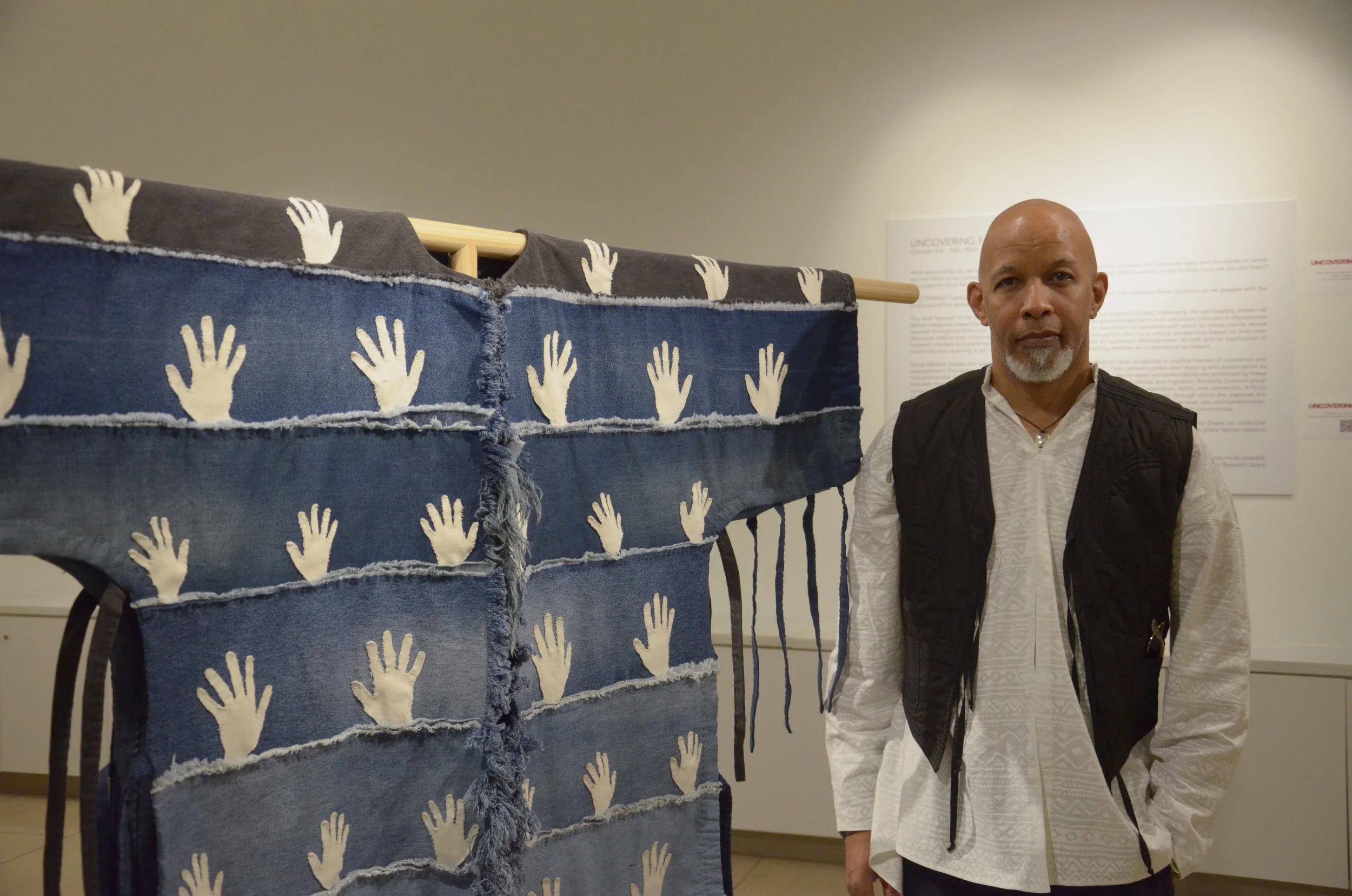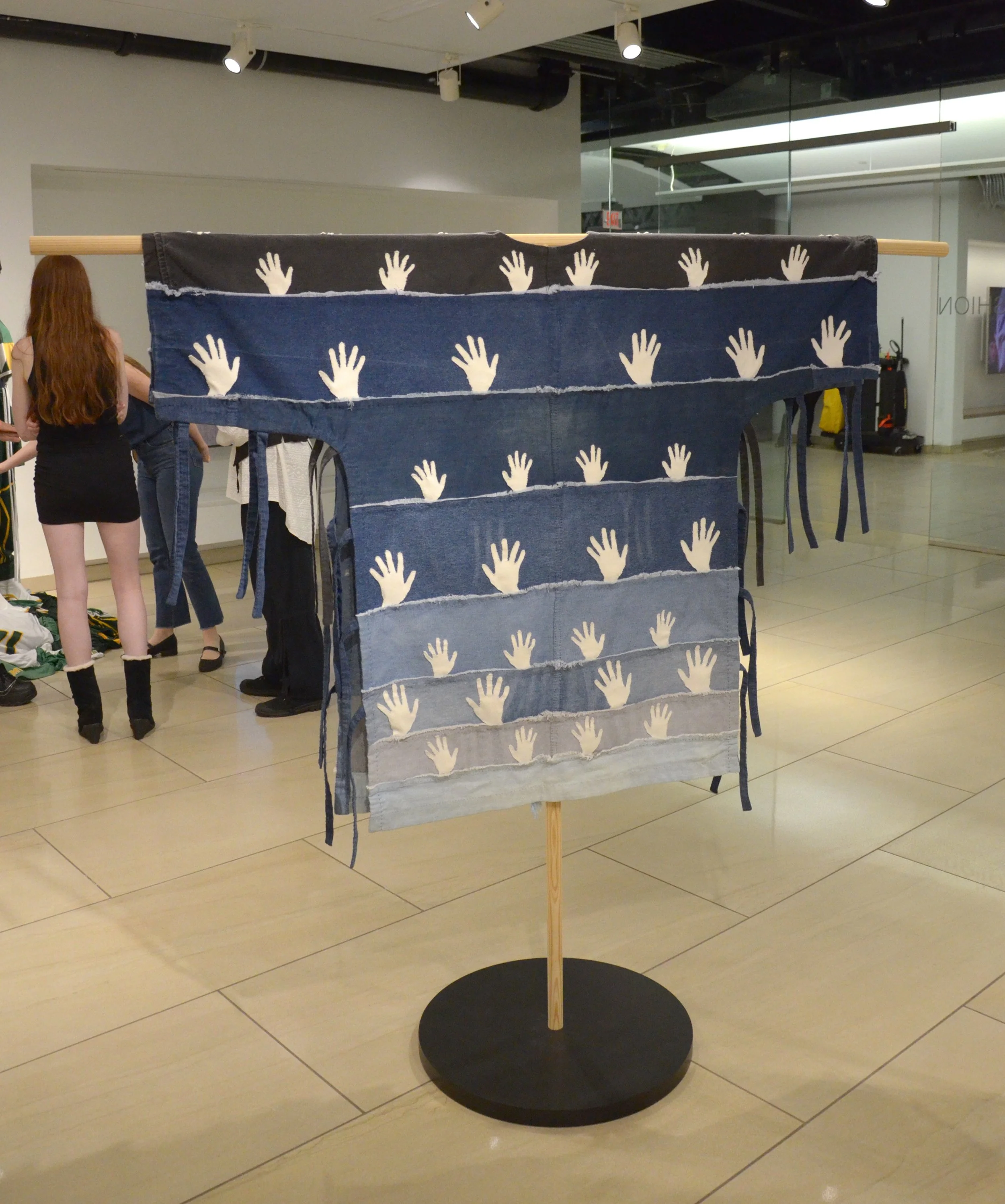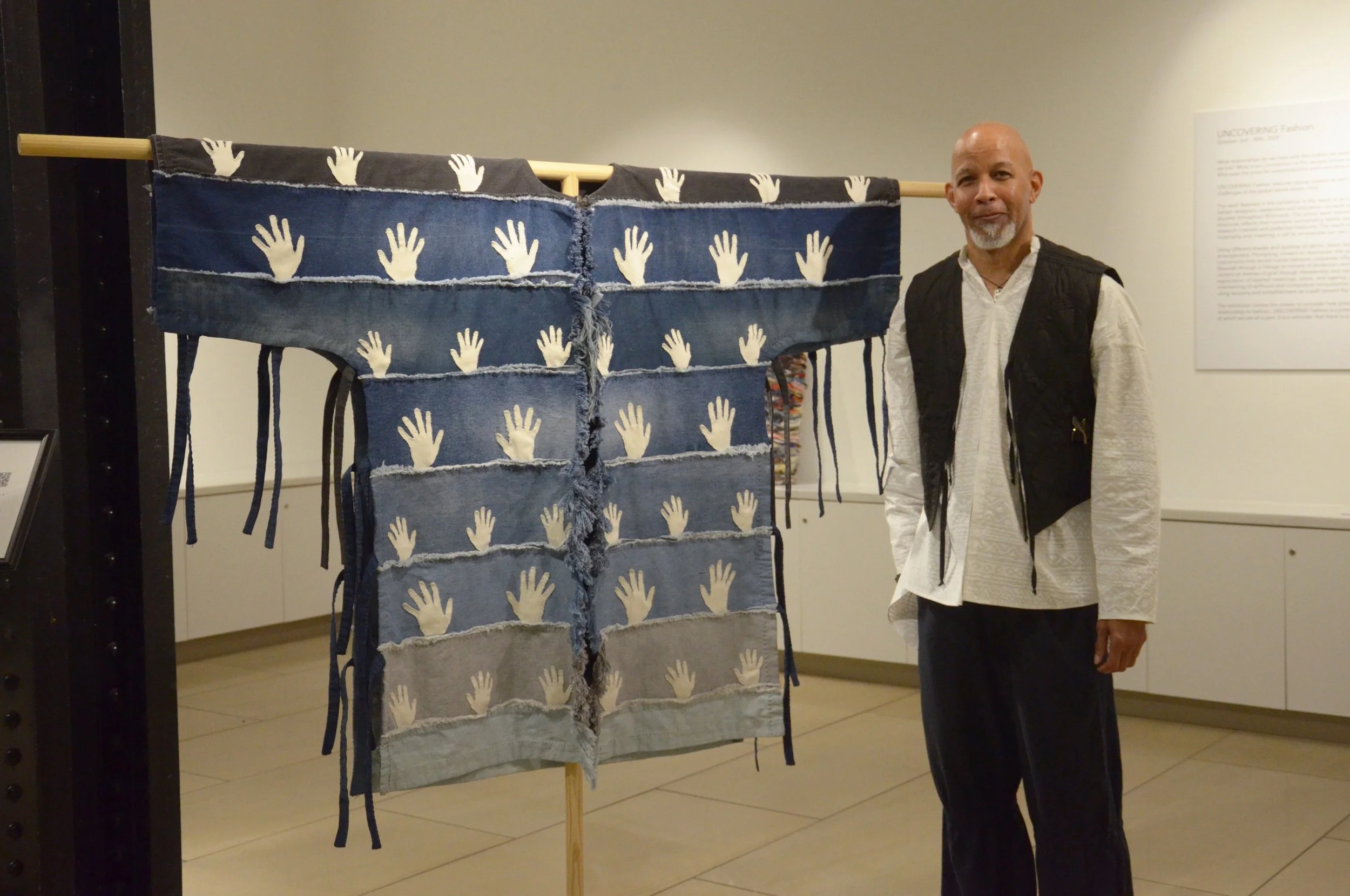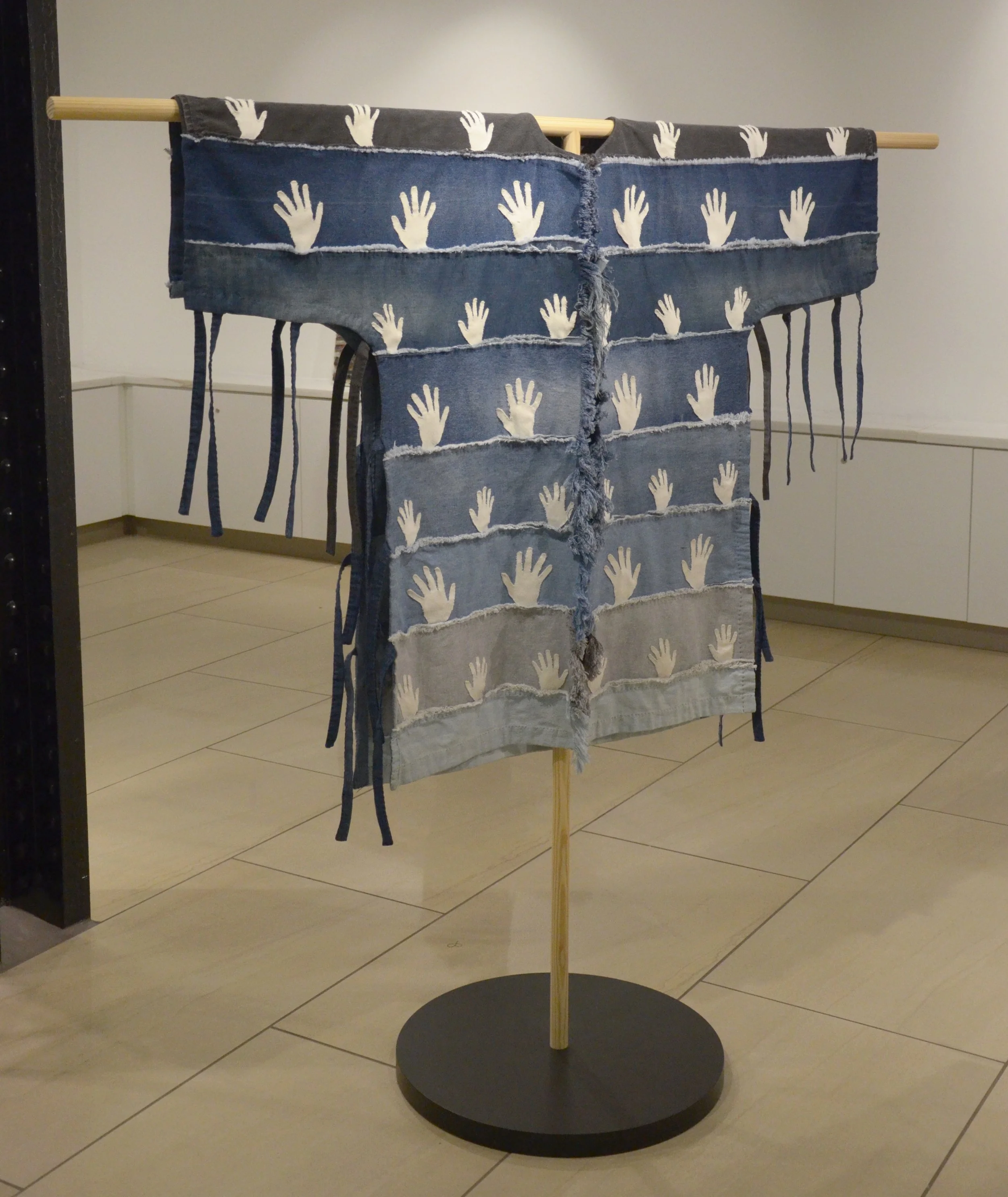 Modeled like a warrior shirt, the piece is entirely hand-sewn. Its denim panels from discarded jeans represent the ocean, while the seams suggest waves. Hands appliquéd to the surface represent how each individual actively contributes to and is at the same time overwhelmed by the abundance of textiles that are continually being discarded, thus we risk drowning in a veritable sea of textiles. In his design work, Sellars uses a textile-first approach, allowing the fabric to determine the design. His silhouettes are simple and minimalist, with a focus on superb craftsmanship and details.